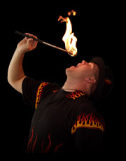Philip DePalo has performed in hundreds of venues in the U.S., Canada, and Europe. He’s entertained top clients such as America On-Line, Carnival Cruise Lines, The Hyatt Regency, and The National Security Agency. From juggling to magic, knives to bullwhips, he will keep you on the edge of your seat. Get ready as he performs stunts which very few have dared to try. Watch as he swallows over two feet of cold steel, and while the audience shivers he heats things up by breathing fire twenty feet into the sky! Get ready for the best in entertainment! |